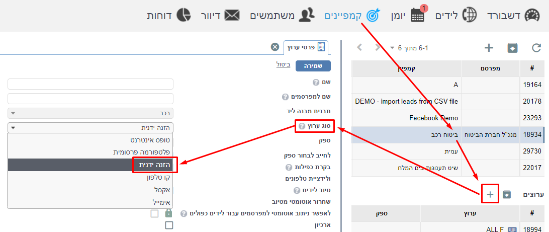 על מנת להזין ליד ידני, חובה שיהיה קיים ערוץ מסוג "הזנה ידנית" תחת אחד הקמפיינים במערכת. ללא ערוץ כזה, האופציה להזנה ידנית לא תהיה זמינה.
